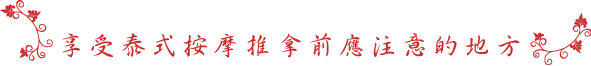 泰式按摩推拿基本上是男、女、老、少咸宜的休閒、保健養生活動,對人體沒有任何不良的副作用,但如果您是剛吃飽飯,則最好先休息半小時之後再接受按摩推拿,才不會妨礙消化機能。此外,如果身體有某些疾病或疼痛等不適症狀,則應暫時不要做按摩推拿活動,待這些不適情形治癒或減輕之後再進行,這樣對您的身體才會有完整與安全的保健作用。所以當您的身體如果有下述情況時,請暫時不要做泰式按摩推拿,或請先告訴美體師或服務人員,她們會妥善處理您的問題: